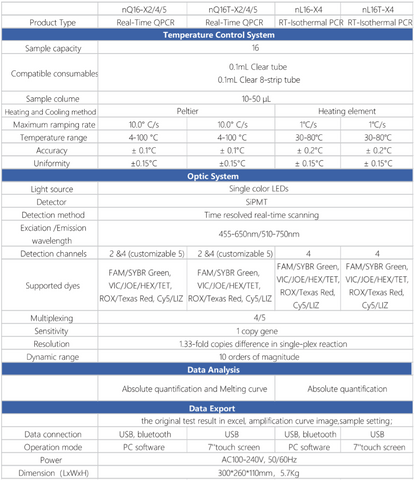 nQ16-X4/5 and nQ16T-X4/5 are easy to use 16-wells Real-Time Quantitative PCR system. The small footprint of platform and ultra-fast ramping speed make it ideal for point-of-care and on-site testing applications.
