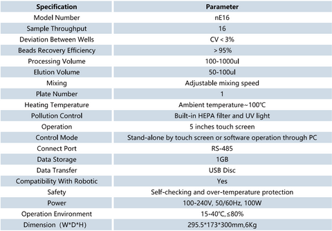 - Flexible: Compact design with small footprint the device can be placed in a biological safety cabinet or a mobile laboratory for quickly extract 1-16 samples at one time.
